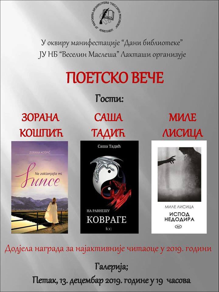 ЈУ Народна Библиотека “Веселин Маслеша” Лакташи, организује “ПОЕТСKО ВЕЧЕ”. Гости вечери